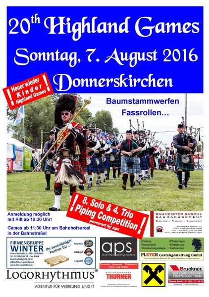 2016 erwartet die Zuschauer außer den illustren Wettkämpfern auch wieder Highland Games für Kinder, schottische Musik bei der 8. Piping Competition in Donnerskirchen – wo Dudelsackspieler im fairen und regelkonformen Wettstreit gegeneinander antreten. Dazu ergänzen gegrillte Spezialitäten von der Fa. Monchicken Grill Catering und Foodtruck & Catering LUV (Christian Leeb), Köstlichkeiten aus Mama´s Küche, schottische Single Malt Whiskys und ausgezeichnete Donnerskirchner Weine vom Weingut Claudia und Werner Reichardt den Festreigen. Vertreten in diesem Jahr auch wieder Stände bekannter Schnapsbrenner und des Inhabers der "Vlad dy Dracul" Degustation, Walter Horvath. Für Schottland Fans gibt’s auch heuer wieder bei „Scottish Things“ alle möglichen schottischen Artikel vom Kilt, über T-Shirts, Ledertaschen, Schals, etc.