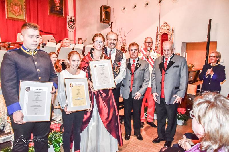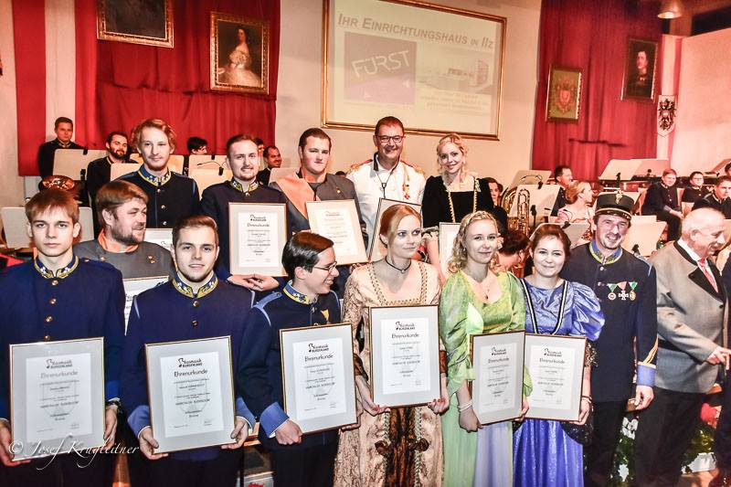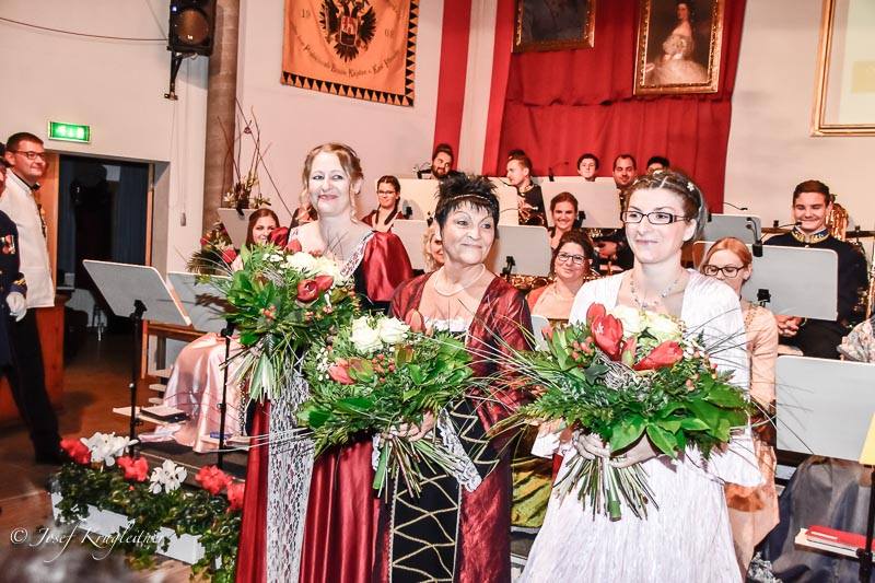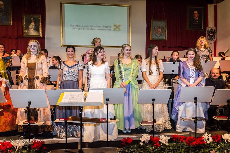 Musiker in Deutschmeister-Uniformen, Musikerinnen in festlichen Tanzroben und ein stilvoll dekorierter Kultursaal vermittelten ein adäquates Ambiente, in dem zackige Regimentsmärsche, klangvolle Walzermelodien und stimmungsvolle Polkaklänge das zahlreich erschienene Publikum begeisterten. „Seine Majestät“ Michael Pimiskern moderierte mit kaiserlichem Witz und Charme und war von den „Augenweiden“ der Marktmusik sichtlich angetan. Im Rahmen des Konzertes wurden auch Jungmusikerleistungsabzeichen und Ehrenzeichen des Burgenländischen Blasmusikverbands an verdiente Musikerinnen und Musiker feierlich überreicht.