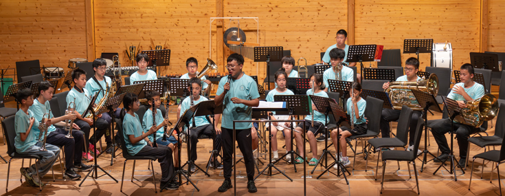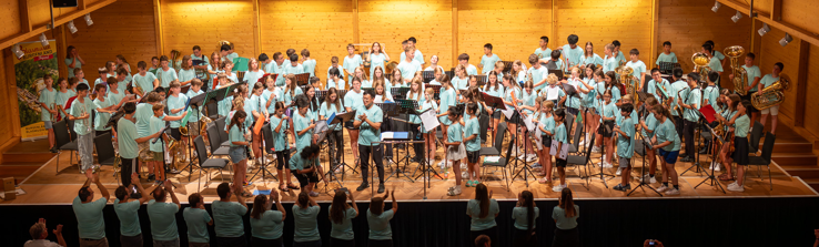 90 Jungmusiker:innen aus dem Burgenland und 33 Jungmusiker:innen aus Qingdao auf der Bühne in Raiding. Blasmusikakademie Junior 2024